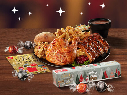 A third rack of BBQ back ribs & a Quarter Chicken served with our Signature Chalet Dipping Sauce, a dinner roll, your choice of side, stuffing, cranberry, and 5 LINDOR Chocolate Truffles. Plus, a Festive Scratch & Win Card** - everyone’s a winner! Order Online